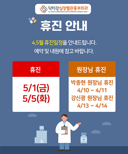 진료시간 안내 월~금요일 AM 08:00 - PM 05:00 토요일 AM 08:00 - PM 12:00 점심시간 PM 12:00 - PM 01:00 ※ 일요일 ㆍ공휴일은 휴진입니다.※ 매주 수요일 강신광원장님 오후 휴진입니다.